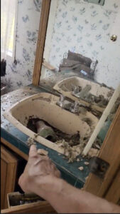 Cindy Collier points out the sink she and her husband climbed on to try to bust out ceiling tiles as the water got chest deep. (Video screenshot)