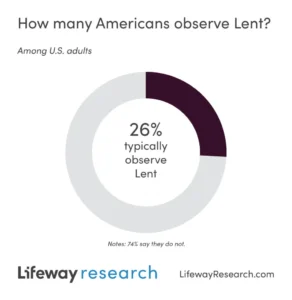 A traditional 40-day window of fasting before Easter, Lent is observed by around a quarter of U.S. adults, according to a Lifeway Research study. Three in 4 Americans (74%) say they do not typically observe Lent, while 26% participate.